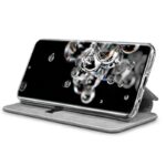 Capa Flip para Samsung G988 Galaxy S20 Ultra 5G com abertura lateral tipo livro. A tampa incorpora uma caixa na qual o móbile se encaixa, permanecendo perfeitamente fixo.